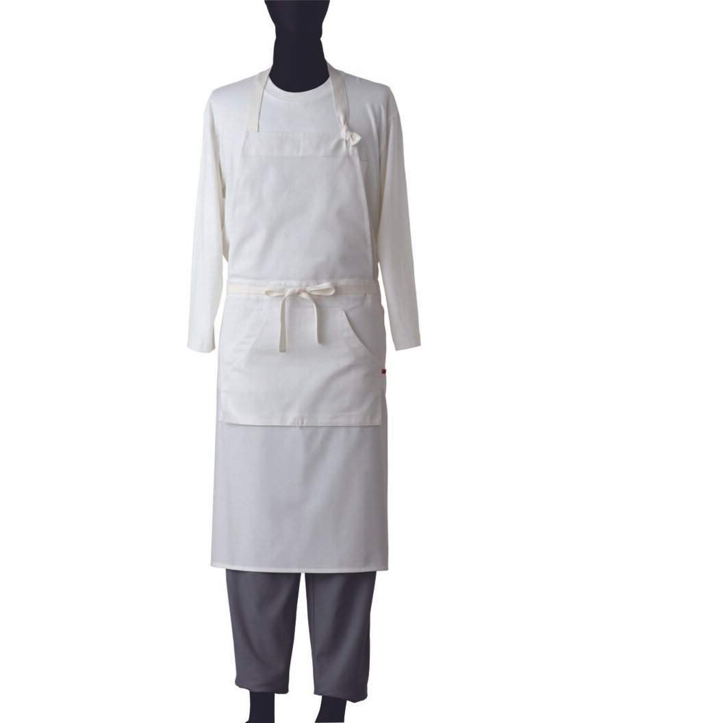 テクスチャーに立体感あり、腰のポケットはパーカーのような1室構造です。肩、腰紐はヘリンボーンテープで微配色。腰紐は後ろ姿の美しさも考えホールを用意し、そこを通して着用するときれいな着用姿になります。スローライフ、カジュアル、カルチャーなどのキーワードに合う胸当てエプロンです。