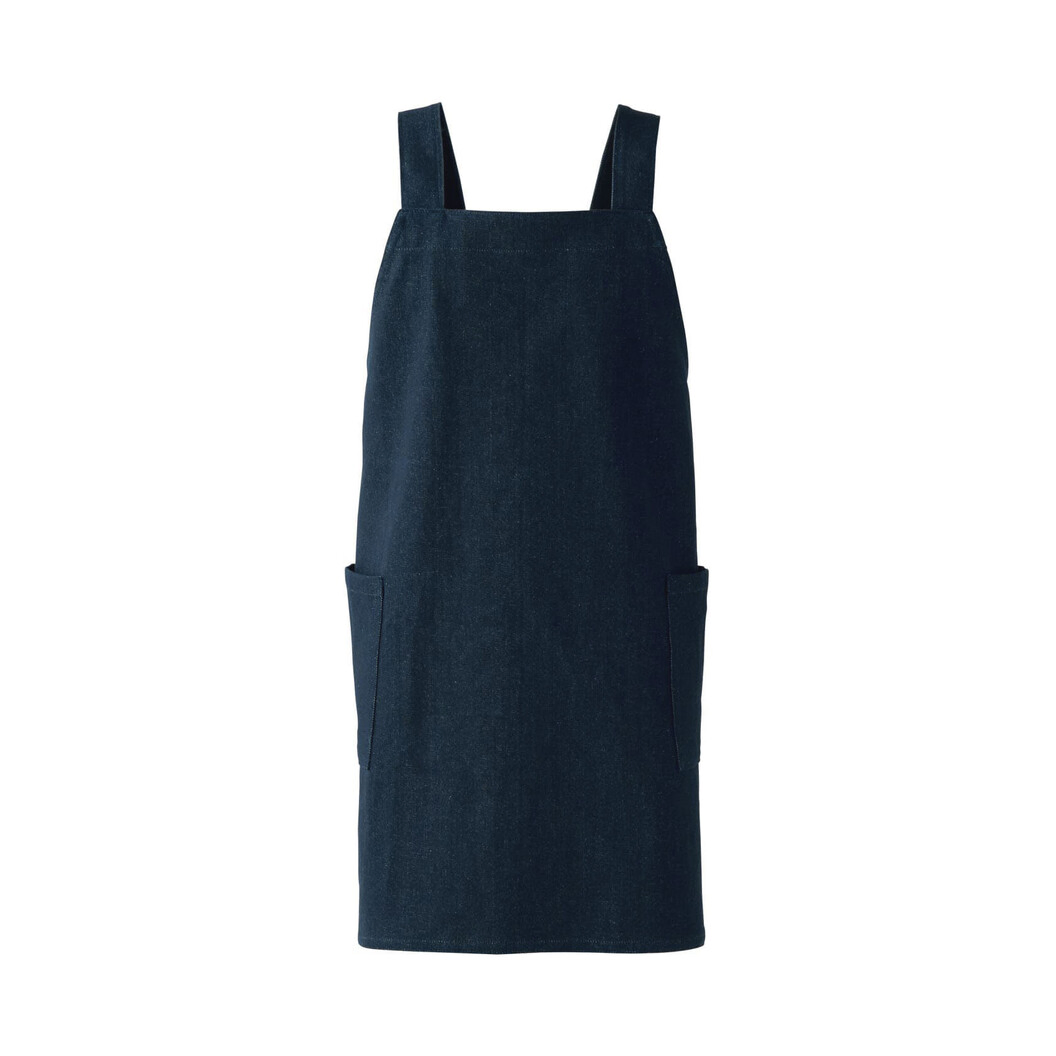100%落ち綿(わた)を使用した13オンスの厚手リサイクルデニムのシリーズ。落ち綿とは、紡績の過程で出る屑綿(わた)のことで、通常は全て捨てられる。かぶって着用するX型の肩紐仕様。調整なしのシンプルな構造。