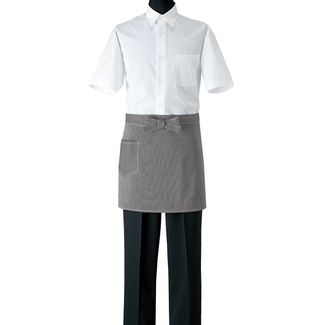 先染のグレー×ブラックのストライプ生地は一見チャコールグレーに見えるところがポイント。クセのない柄、シックな色のエプロンです。綿リッチですがポリエステル混素材ですので耐久性の高い素材になっています。ポケットが2つあり腰の右ポケット内側にもペン刺しポケットがあります。