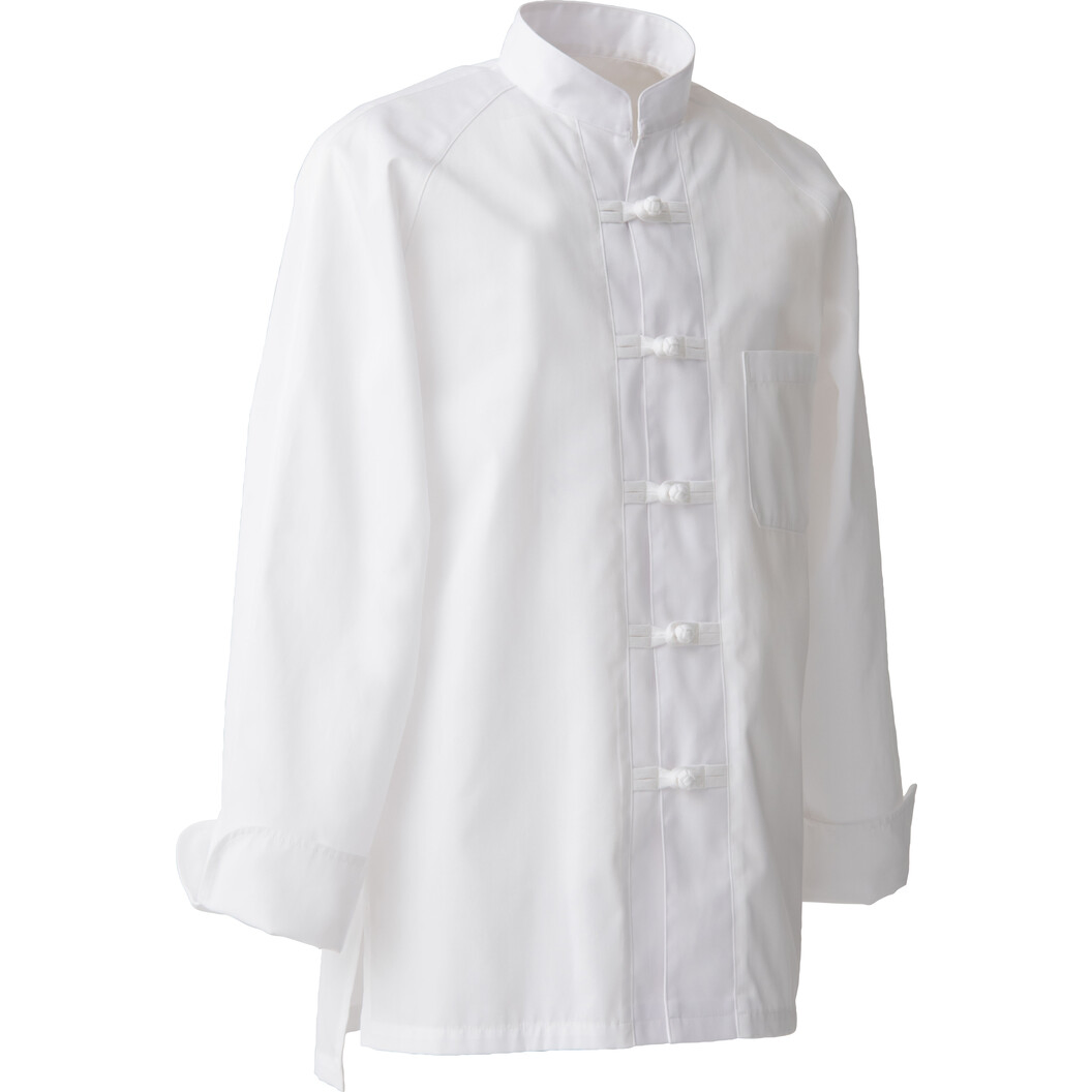 ライトツイルという新しく開発した生地のコックコート、チャイナ風ボタン版です。商品開発意図は昔ながらの分厚いコックコート同等の耐久性を持ち合わせながら、生地が薄く、着用感が軽くて涼しいというところです。脇にスリットあり、裾を出して着用することにも適しています。ポリエステル70%、綿30%ですが綿リッチな風合いも特徴です。一度ご試着いただき新しい着心地を感じて下さい。制電糸入り。透け防止、UVカット機能あり。男女兼用。
