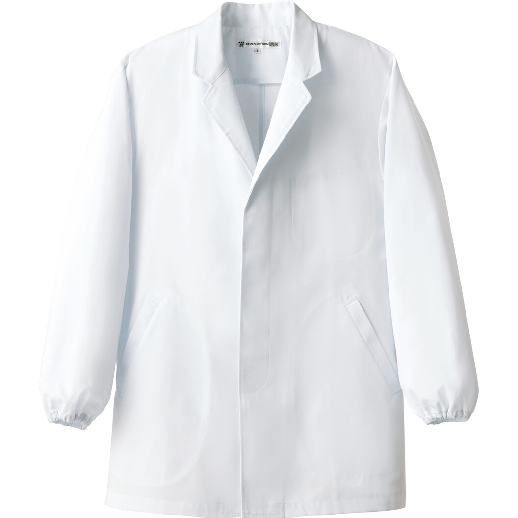 コートとしてしっかりとした厚さのある生地、綿ポリエステル混率、ツイル組織のコートです。抗菌防臭機能あり。定番的な白衣デザインの一つですので多くのシーンで着ていただけます。デザインポイントして比翼仕様、ボタンが見えないところにモダンさを感じます。袖口はゴム仕様ですので袖を好きな位置に上げて着用することができます。またそのゴムはオリジナルで耐熱性があります。洗濯性に優れ、通常のものより永く使えます。腰に左右ポケットあり、左胸内側にもポケットあり。男性用。