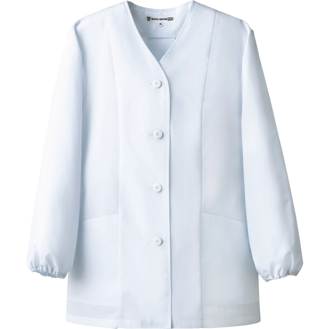 コートとしては薄手の生地、綿ポリエステル混率、平織り組織のコートです。抗菌防臭機能あり。定番的なコート生地と比べて薄手なので着用感が軽いです。袖丈は長袖ですが袖口がゴム仕様ですので好みの位置まで上げることが出来ます。またそのゴムはオリジナルで耐熱性があります。洗濯性に優れ、通常のものより永く使えます。背中には大きなボックスプリーツがありますのでゆったりと着用できます。腰に左右ポケットあり。女性用。