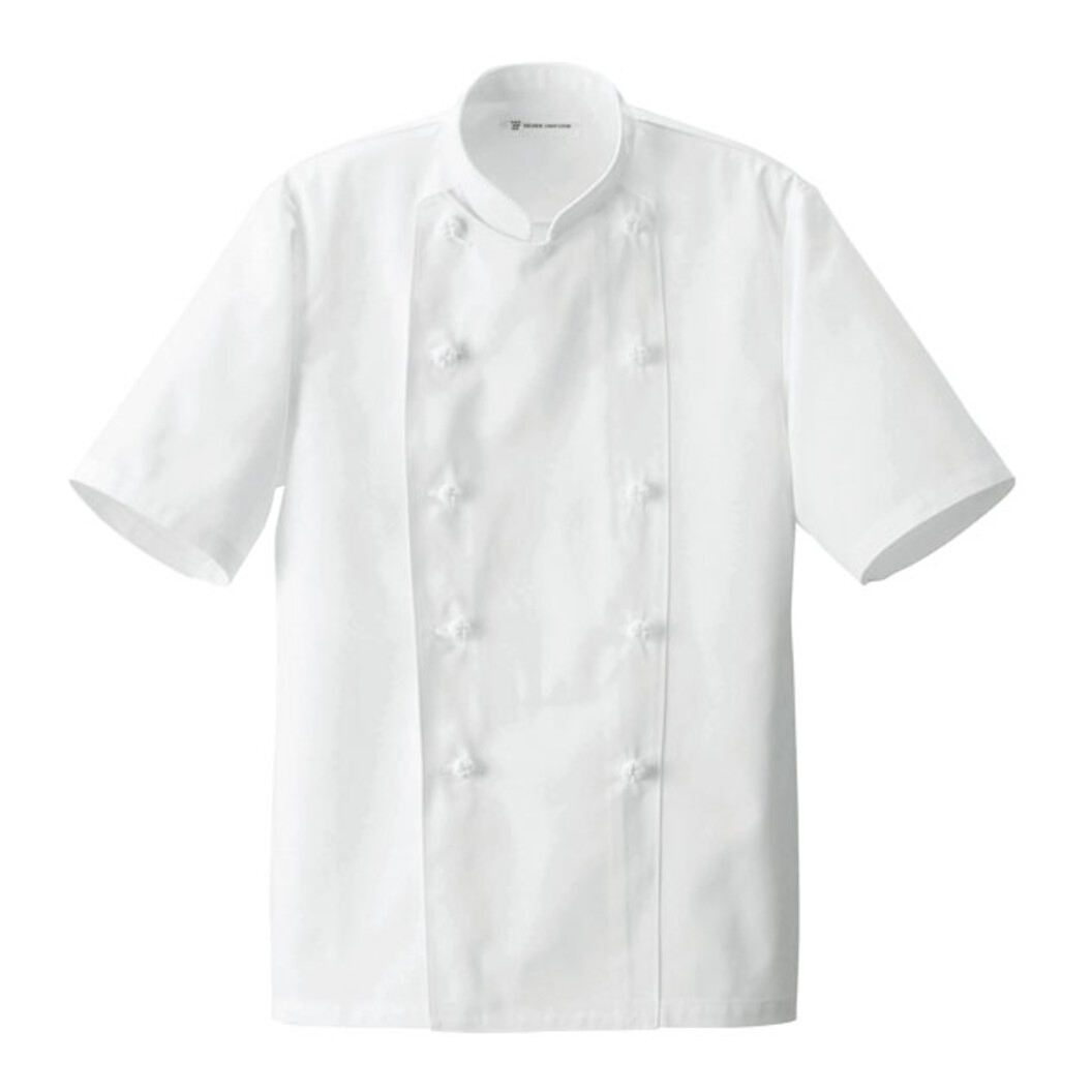 定番半袖コックコートAA499-0の袖口アンダーカバー仕様のアイテム。袖の内側に別布袖があり袖口は幅広のゴムで絞る仕様になっています。異物混入を防ぐ衛生的な仕様になっています。