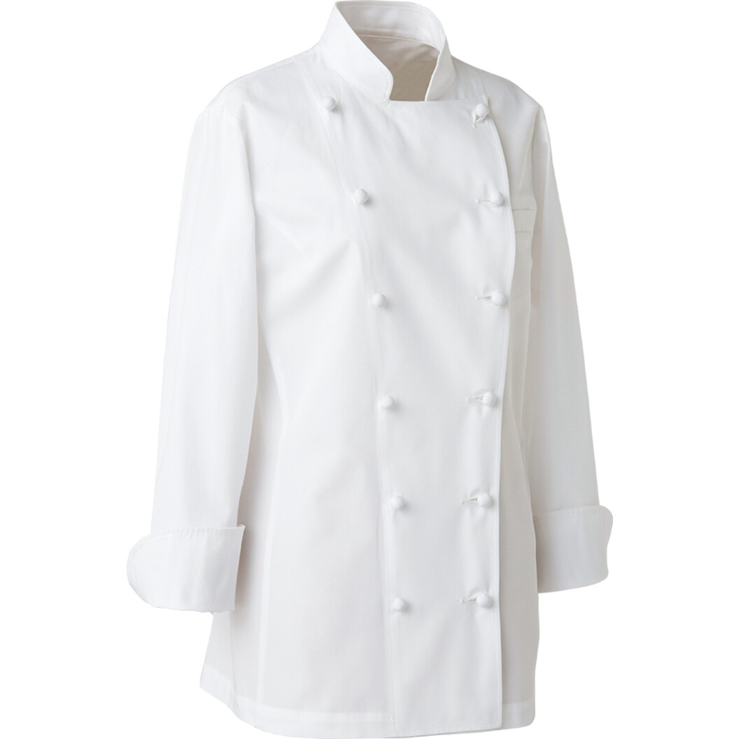 上質な超長綿を用いた女性向けのドレスコックコート。女性の体型に合わせて胸のダーツ、ウエストからヒップにかけて構築的なカッティングを施していますので、着用時とても美しいシルエットになります。袖脇下に菊穴がありコックコート内の熱を多少放出しますので、快適な着心地を得ることが出来ます。同じ脇下にマチというパーツがあり腕の稼働がとても楽です。共布くるみボタン。