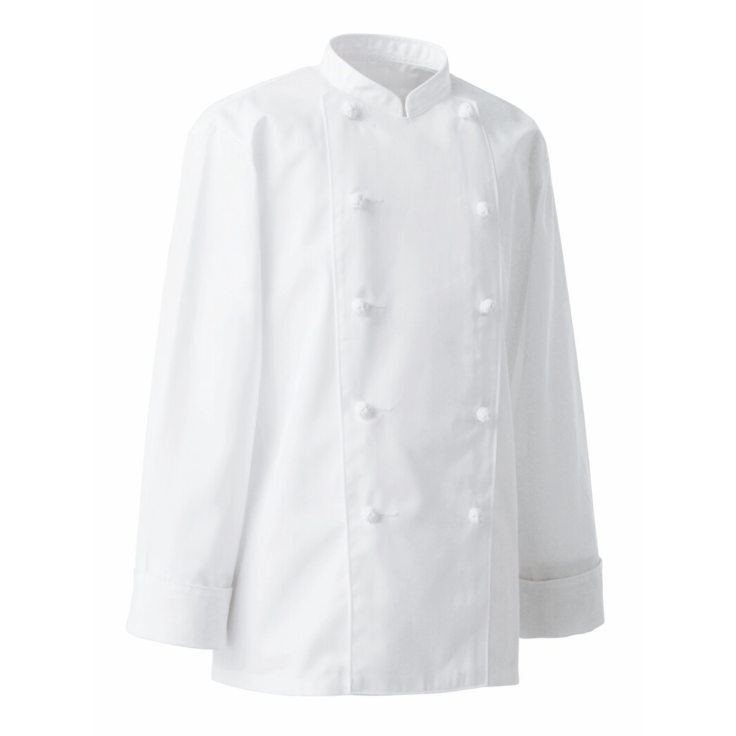 ポリエステル・綿混紡のオリジナル素材を使用した定番コックコート。綿100%のものと比べ、洗濯性がよく、シワが出にくいのが特徴です。デザインは組紐ボタンの基本的なかたちになっています。内ポケットあり。ポリステル・綿素材のコックコートの中では一番売れているものになります。