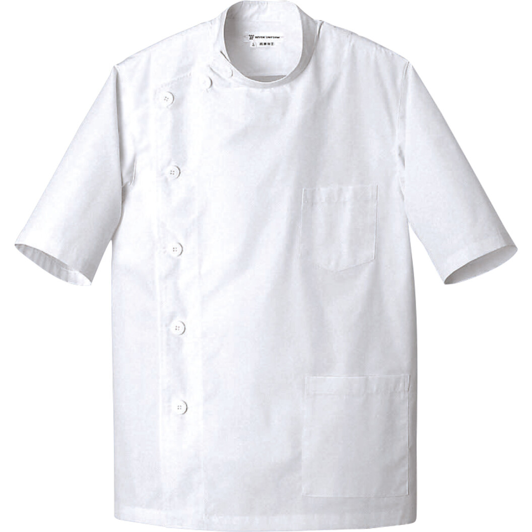 コートとしては薄手ですのでやや軽めの着心地感を得られ、生地のハリコシによりきちんと見えるメディカルタイプです。前はスタンドカラーから繋がる右身頃、後ろは共布ベルトの上下にタックディティールが施されているところがデザインポイント。後ろタック上は腕を楽に大きく動かせ、ベルト下のタックはヒップ周りのゆとりになっています。薬局や美容系、近年では給食など中食白衣までと幅広く使用されております。抗菌防臭加工あり。5分袖。左見頃の胸と腰にポケットあり。男女兼用。
