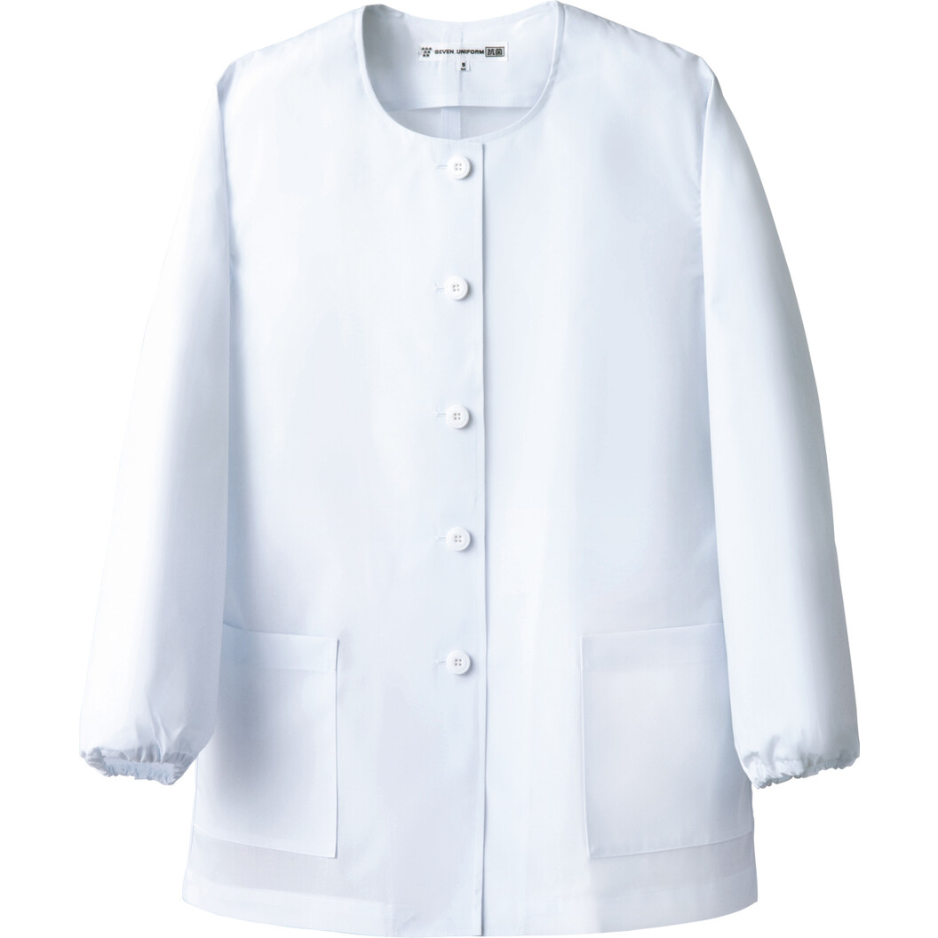 コートとしては薄手の生地、綿ポリエステル混率、平織り組織のコートです。抗菌防臭機能あり。定番的なコート生地と比べて薄手なので着用感が軽いです。袖口にはゴムが入っていますので、好きな位置まで上げて作業しやすい袖丈にすることが出来ます。またそのゴムはオリジナルで耐熱性があります。洗濯性に優れ、通常のものより永く使えます。長袖。腰に左右ポケットあり。後ろベントあり。女性用。