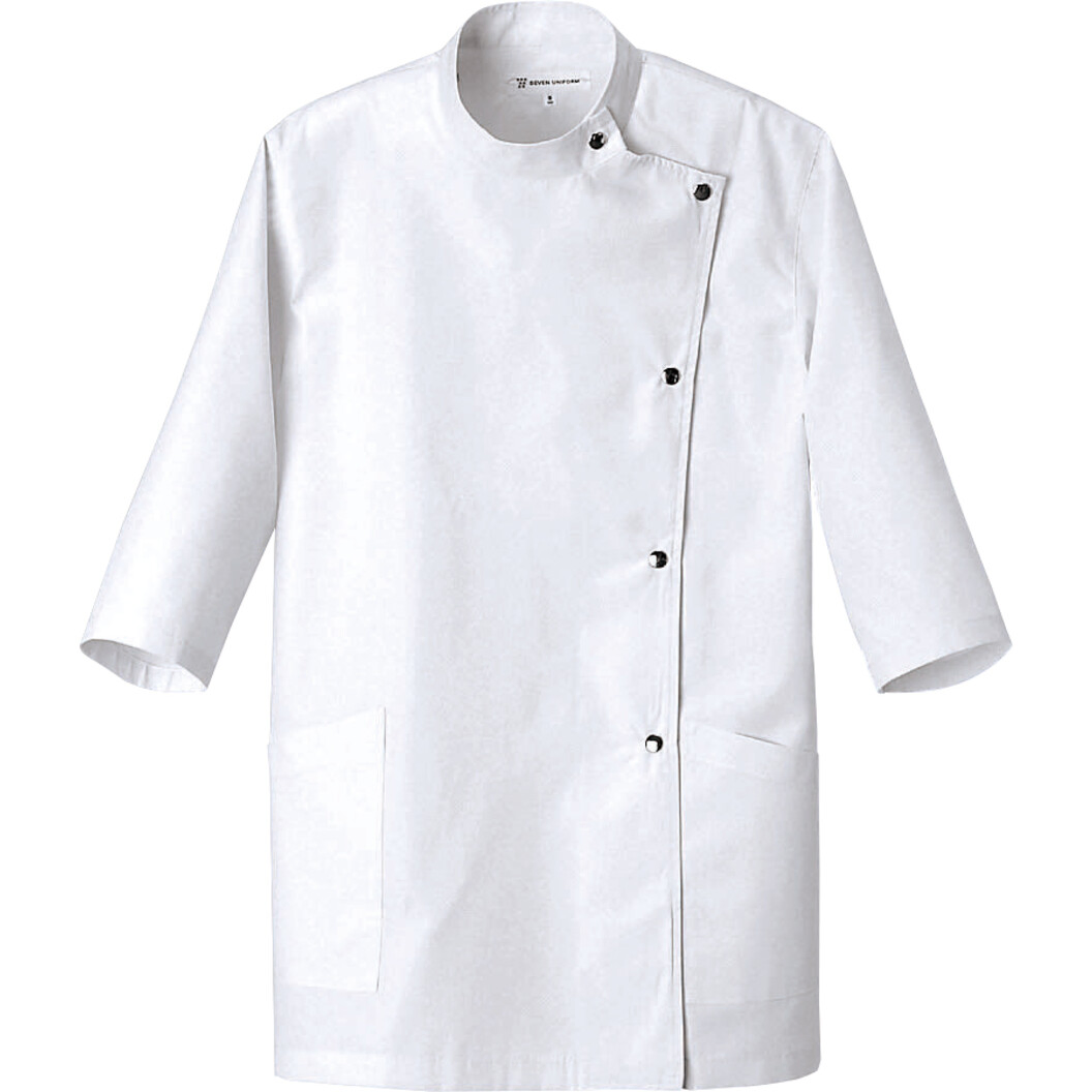 コートとしては薄手ですのでやや軽めの着心地感を得られ、生地のハリコシによりきちんと見えるメディカルタイプです。スタンドカラーと左身頃、共に金属ドットボタンがデザインポイント。メディカルらしさを感じさせます。薬局、美容、中食白衣と幅広く利用されています。抗菌防臭加工あり。7分袖。腰に左右ポケットあり、右のみペン刺し用ポケットあります。女性用。