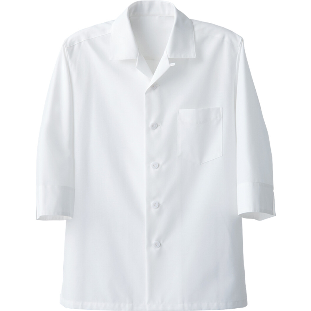 この製品の特長はシワにならないこと。洗濯してそのまま干せば翌日きれいなユニフォームとして着用出来ます。また働いている時に出来るシワもかなり少なく、手でシワを伸ばせばある程度無くなります。吸水性、速乾性もあります。合わせて汚れを落としやすい生地ですのでケアがとにかく楽です。デザインはシンプルな開襟コート。第一ボタンを開ければ開襟、閉めればシャツカラーになる2wayです。白はどんなシーンでも合わせやすく、ネイビーは和のコーディネートとしてオススメです。