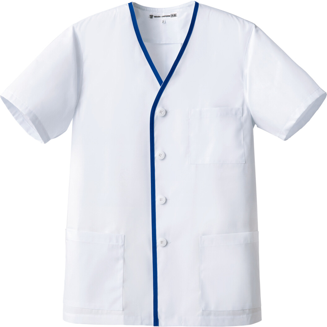 コートとしては薄手の生地、綿ポリエステル混率、平織り組織のコートです。抗菌防臭機能あり。定番的なコート生地と比べて薄手なので着用感が軽いです。襟ぐりから前立てにかけてブルー配色のデザインが施されているところがデザインポイントです。半袖。左胸、腰に左右ポケットあり。後ろベントあり。男性用。