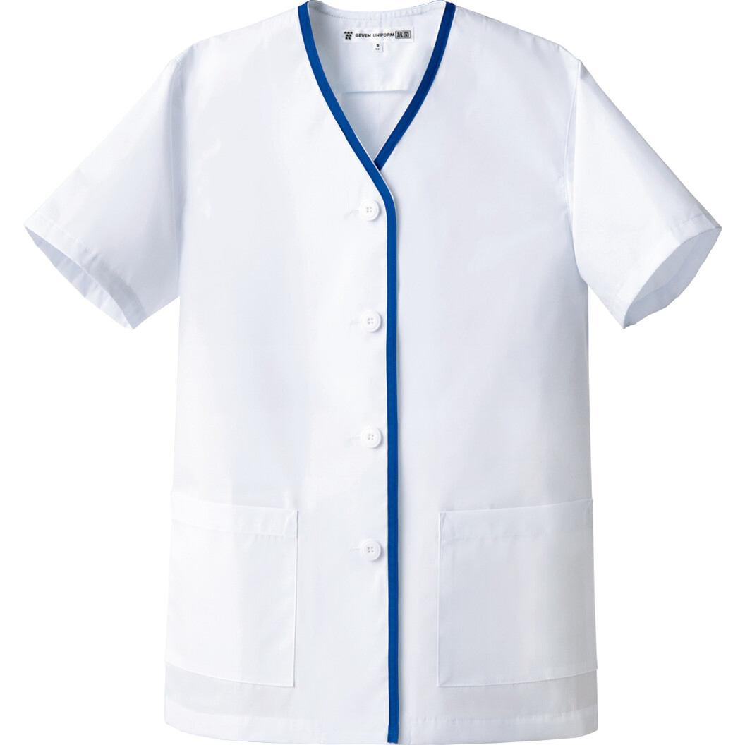 コートとしては薄手の生地、綿ポリエステル混率、平織り組織のコートです。抗菌防臭機能あり。定番的なコート生地と比べて薄手なので着用感が軽いです。襟ぐりから前立てにかけてブルー配色のデザインが施されているところがデザインポイントです。半袖。左胸、腰に左右ポケットあり。後ろベントあり。女性用。