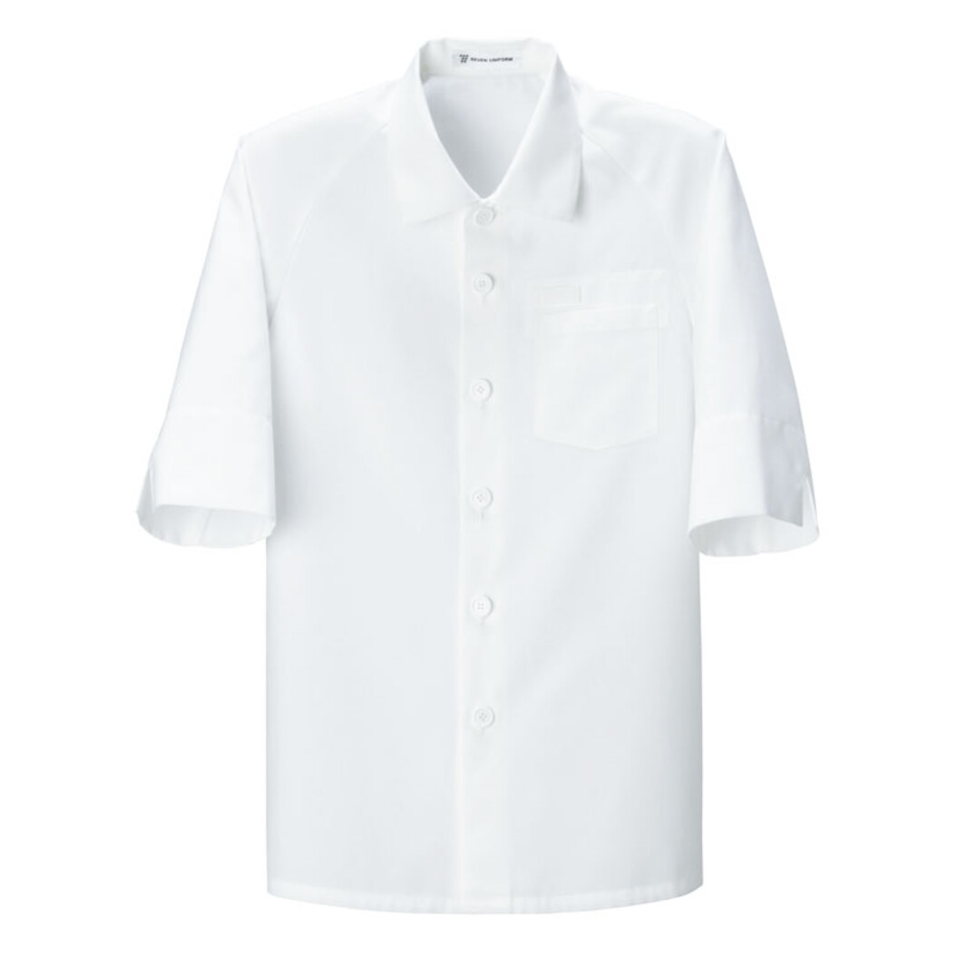 この製品の特長はシワにならないこと。洗濯してそのまま干せば翌日きれいなユニフォームとして着用出来ます。また働いている時に出来るシワもかなり少なく、手でシワを伸ばせばある程度無くなります。ステンカラー、左胸ポケット、ネームチーあり、5分袖。