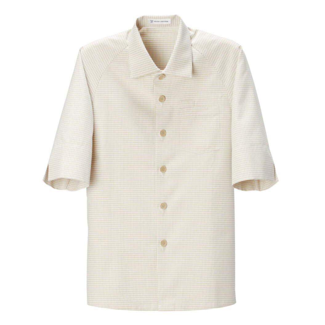 この製品の特長はシワにならないこと。洗濯してそのまま干せば翌日きれいなユニフォームとして着用出来ます。また働いている時に出来るシワもかなり少なく、手でシワを伸ばせばある程度無くなります。吸水性、速乾性もあります。合わせて汚れを落としやすい生地ですのでケアがとにかく楽です。ステンカラー、左胸ポケット、ネームチー付き、5分袖です。
