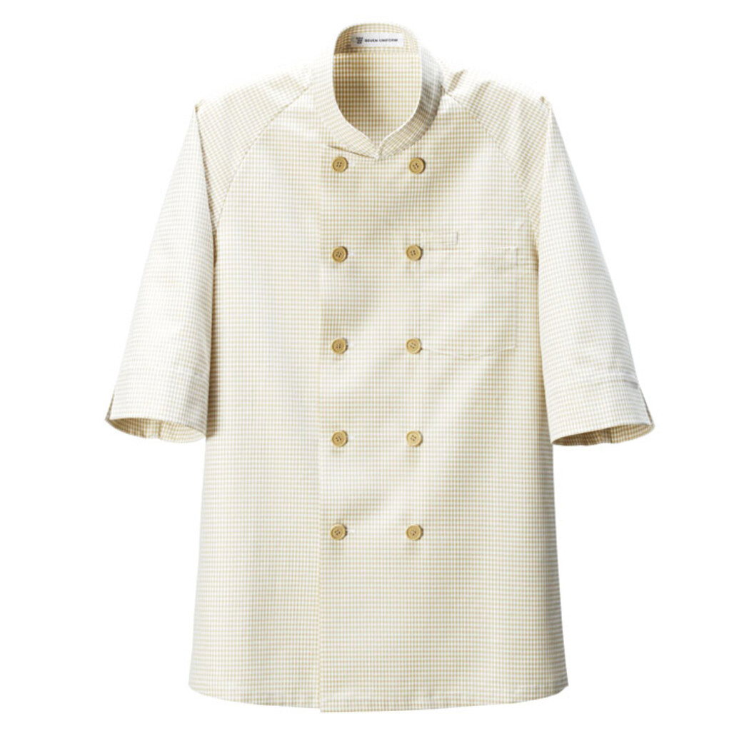 この製品の特長はシワにならないこと。洗濯してそのまま干せば翌日きれいなユニフォームとして着用出来ます。また働いている時に出来るシワもかなり少なく、手でシワを伸ばせばある程度無くなります。吸水性、速乾性もあります。合わせて汚れを落としやすい生地ですのでケアがとにかく楽です。ギンガムチェック柄ですが少し離れると無地に見えるので、着用しやすいものになっています。スタンドカラー、前見頃はコックコート風デザイン、5分袖、ネームチーあり。