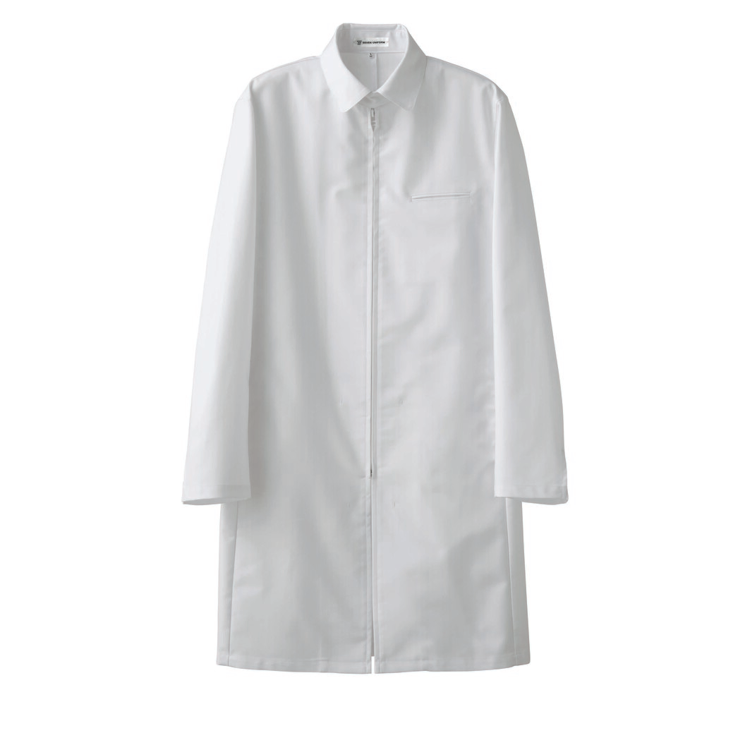 開発の意図はカウンセラーコートとして。前のファスナーはモダンさと着崩れしないことで、おもてなしの気持ちをしっかり表現します。襟下にタブがあり、構築感あるディティールが専門性を感じさせます。例えボタンを外して着用してもそのタブがラボラトリー感を演出します。腰には縫い目利用のポケットがあります。受付や案内、高度な内容の商品説明を含んだ接客など、新しいジャンルのサービスが増えていく中、一つの提案商品として開発しました。
