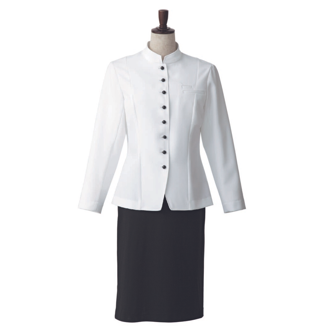 ポリエステル100%ですが毛混生地のような風合いと柔らかさを併せ持つ高級感漂う生地です。耐久性もあります。ストレッチがありますので動き易く、制電糸が織り込まれていますので埃などを寄せ付けにくく、白さを保つために洗濯時に汚れを落としやすくする加工が施されています。裏地無し。前の黒い半球型ボタンとボタン数が多く付けられているところが特徴ですが、後ろ姿にもデザインが施されています。フックベントとボタンが付いている軍服ディティールがよりクラシカルで素敵です。