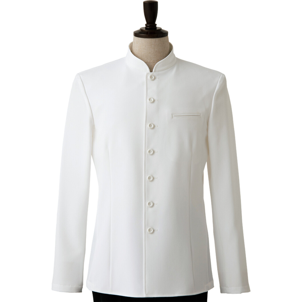 バンケット用として開発されたコートです。特徴は着丈が長いところ。どんな姿勢でも後ろ姿のホスピタリティーをキープするべく計算された長さです。ポケットは必要な胸部分のみ、ネーム用です。裏地はなく、洗濯性や耐久性高い生地で作られています。ストレッチがありますので動きに対してストレスはありません。制電糸も入っていますので埃などは寄せ付けず、白のみですが汚れを落とし易い加工が施されています。生地混率はポリエステル100%ですがウール生地のスーツ生地のように見える高級感があります。後ろに浅めのベンツがあります。インナーはTシャツで良いですが、シャツを着てさらにエレガントに襟元を見せる着こなしもオススメです。