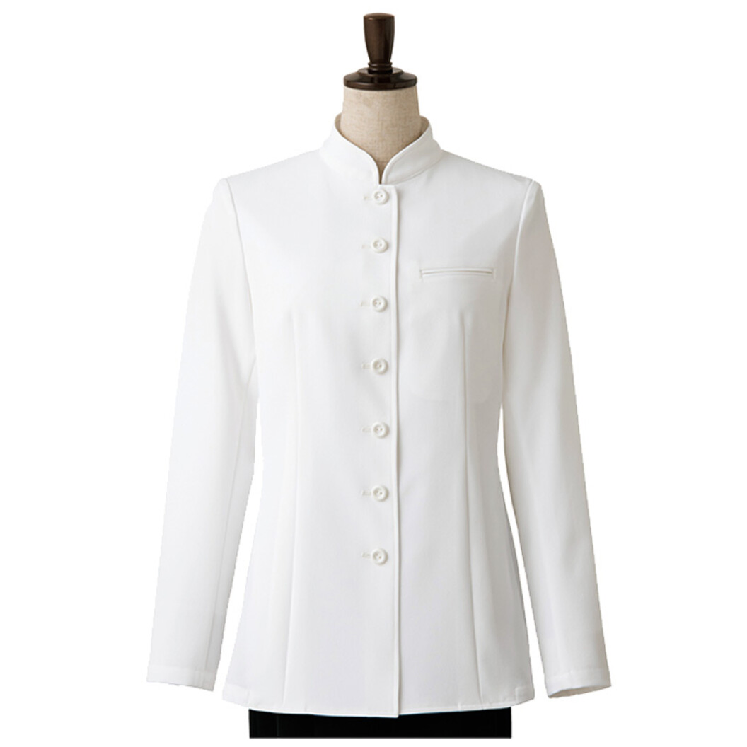 主にバンケット用として開発しました。よくあるコートとの違いは着丈が長いところ。どんな姿勢になっても後ろ姿のホスピタリティーをキープする長さがポイントです。バンケット仕事は意外とハードです。無駄なポケットは省きました。胸ポケットはネームをつけるためです。裏地なし、洗濯性、耐久性も高い丈夫な生地です。白に関しては汚れが落ちやすい加工が施されていますので気兼ねなく着用できます。ストレッチもありますので動きに対してストレスはありません。制電糸も入っていますので埃なども寄せ付けにくいものになっています。女性用として開発していますので着用時のシルエットはとても美しいものになります。