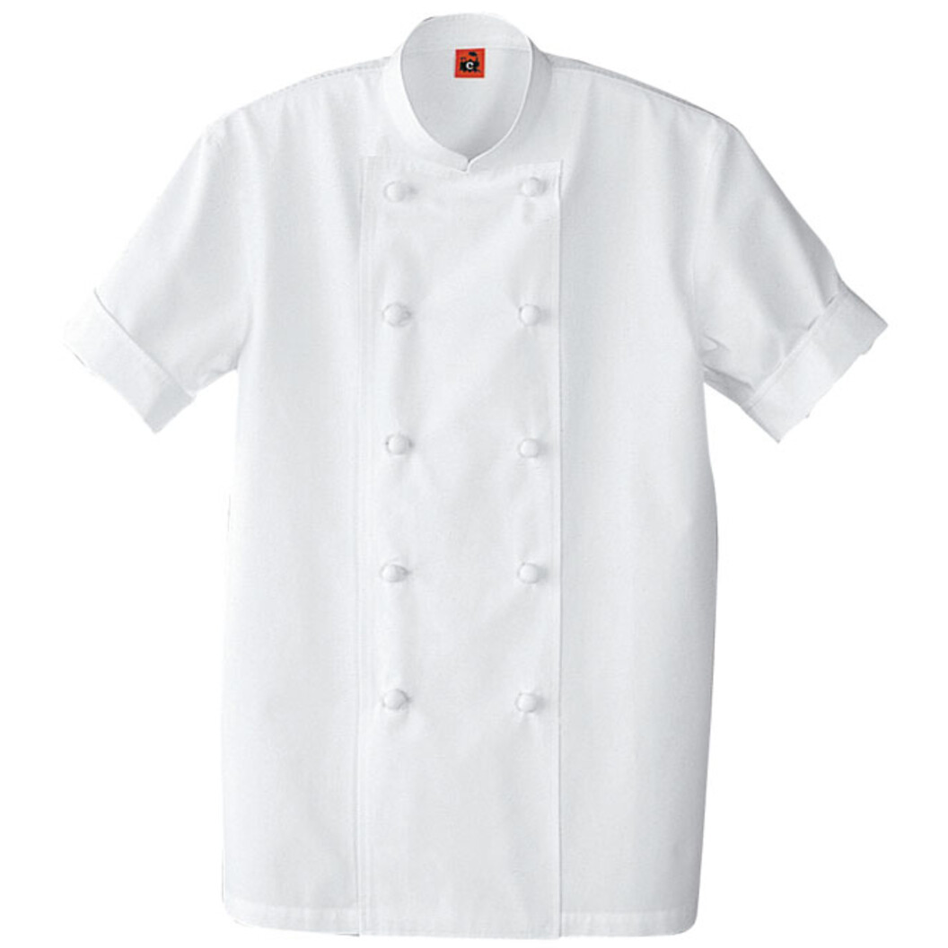通気のよいヘアコード生地を使用していますので、軽くて涼しいコックコートです。QA7300-0の半袖版です。左見頃内側にポケットありIPHONE程度が入る大きさです。共布くるみボタン、袖口はカフスを織り上げて着用すると素敵です。シェフからサービスまで。