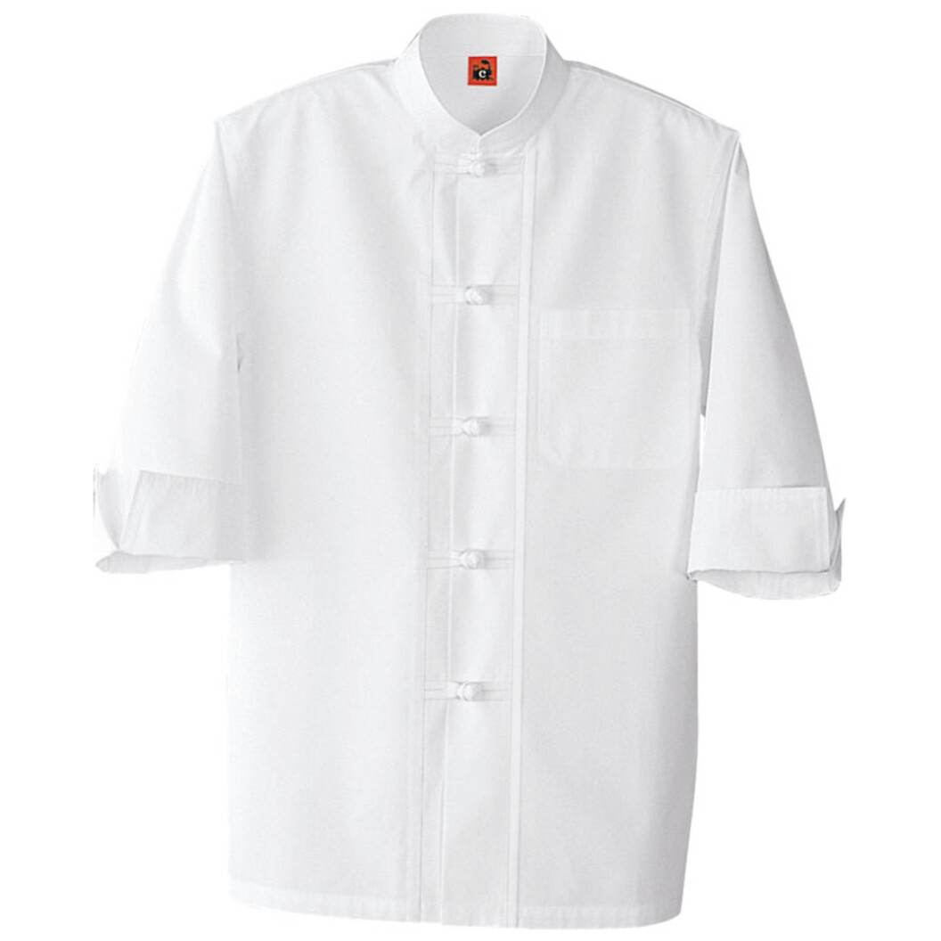 通気の良いヘアコード生地を使用し軽くて涼しいコートです。組紐でのチャイナ風ボタンがとても個性的です。袖はカフス折り上げて7分袖。デザイン性が高いのでシェフはもちろん、サービスコートとしてもオススメです。