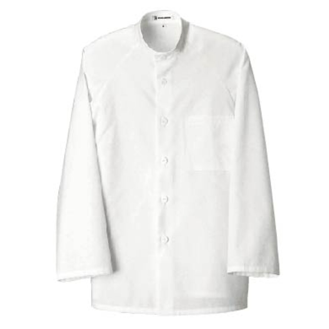 シワになりにくい生地のシンプルなコートです。ラグラン袖は比較的色々な体型に合わせやすいカッティングです。スタンドカラー、シングル合わせというシンプルなデザインですのでコーディネートの巾の広いアイテムです。シェフ、料飲サービスから物販まで。