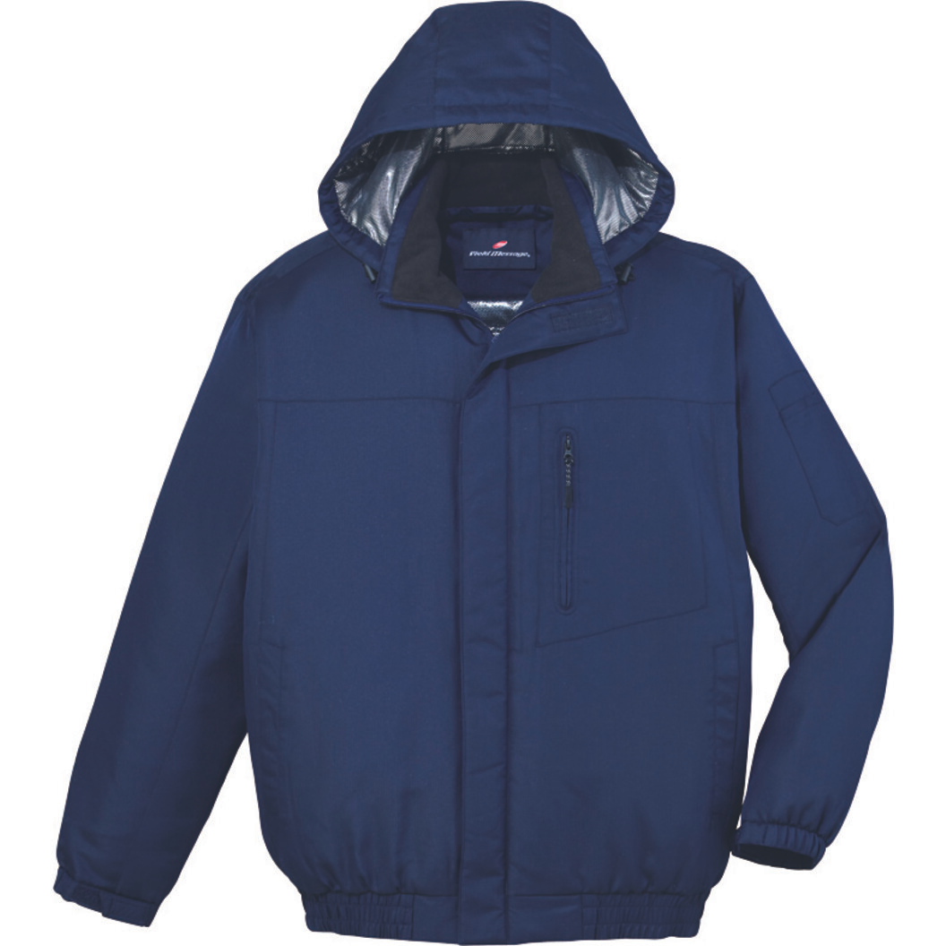 裏アルミプリントによる輻射熱(ふくしゃねつ)を利用し、魔法瓶効果で保温性を高めたアウトドアテイストの軽量防寒。両サイドにポケット有、取り外しフード(ボタン)がございます。