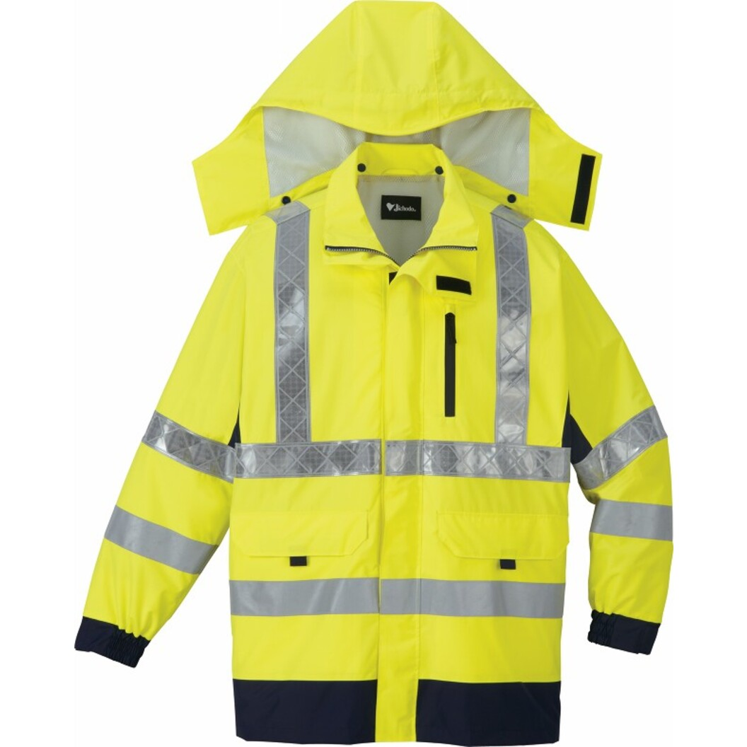 高視認性安全服の規格 ISO20471 JIS T 8127 に準拠したシリーズ。蛍光素材と再帰反射テープを使用した高視認性レインウェア。薄暮や夜間作業時の視認性を高めることで、着用者の安全性を考慮した一着。【全方向再帰反射テープ】本製品はISO20471 規格 に準拠した日本製の再帰性反射テープを使用しています。着用者のあらゆる動きに対し、全方向から認識可能な設計になっており、安全性を高めています。