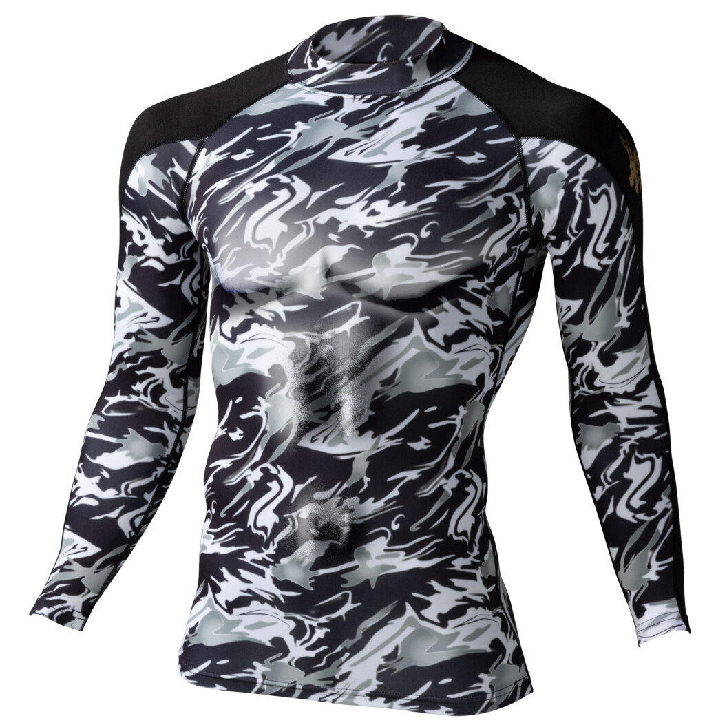 寒い冬に最適な吸湿発熱加工素材。ゴールドのプリントが映えるデザインに強力な消臭&抗菌と吸汗速乾、吸湿発熱の機能も持ちあわせたハイパフォーマンスインナーです。