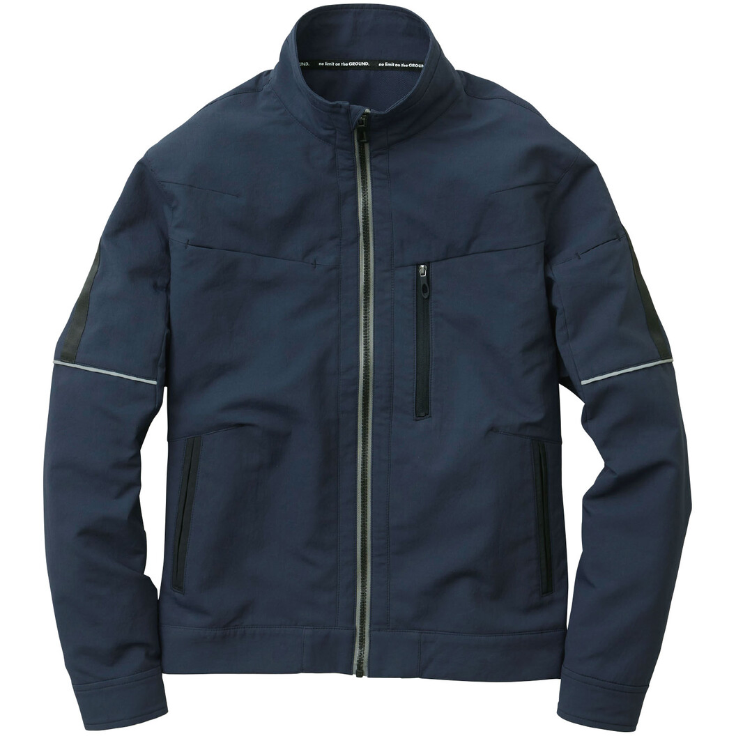 従来のワークウェアと一味違うデザイン性とストレッチ性を兼ね備えたスポーツテイストの軽量ブルゾン。G.G.ロゴ無し(衿裏以外)。信頼の日本製軽量ストレッチダブルクロスを使用。東レ「ライトフィックス®」による軽くて伸びる快適な着心地。マスク加工(シワ加工)を施したカジュアルライクな表面感。制電性素材で静電気の発生を抑える。動きやすさを追求した高いストレッチ性。不快なニオイを軽減するデオドラントテープ付き。反射プリント・反射パイピング使いによる高視認性。