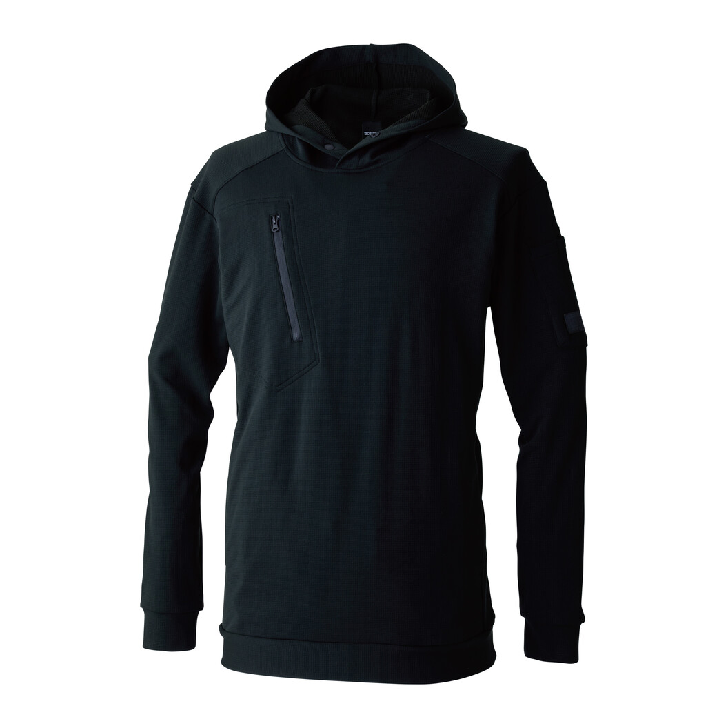 「ドライワッフル」を使用した現場仕様の蒸れにくいフーディー。軽量性、疎水性、断熱性という特徴のあるポリプロピレンを使うことで、程よい肉厚感ながら、軽くて程よい暖かさ、汗をかいてもドライな状態を保つことができる。袖口はリブ仕様で腕まくりがしやすい。左袖ペン差しにはオールブラックのニッカーズオリジナルネーム付き。【特徴】ポリプロピレンによる疎水性・右胸ファスナーポケット・首元ボタン・左袖ペン差し・袖リブ仕様【収納力】右胸ファスナーポケット・左袖ペン差しポケット・両脇ポケット【ドライワッフル】繊維の中で最も軽くて保水しない素材であるPP(ポリプロピレン)を肌側に使用することによって、汗をかいても蒸れにくくベタつかない。断熱性と速乾性に優れており、快適に着用し続けることができます。