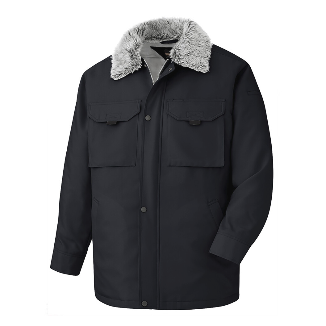 着脱式衿ボア式のシンプルなドカジャンです。デザインがシンプルでサイズ展開も豊富なので男女兼用でご利用いただけます。各所に収納に便利なポケットがあります。二重袖とスピンドルコードで冷気をシャットアウトできます。