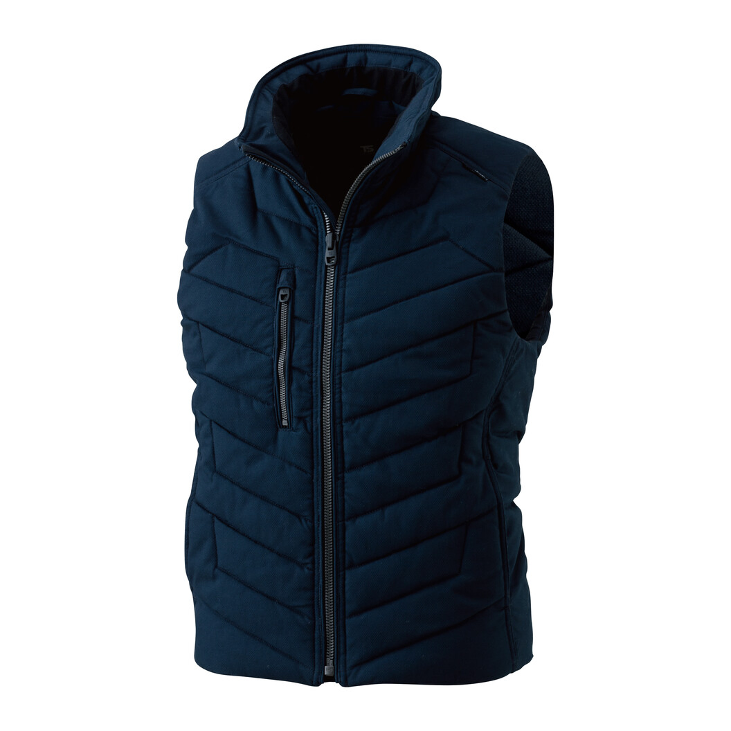 タフさと保温力を兼ね備える、綿ライク素材なのに軽量性抜群のベストです。ポリエステル高混率なのに綿リッチ!裏地はTSDESIGNオリジナルエンボスプリント。脇ポケットにハンドウォーマー機能。チンガード付き。襟裏フリース仕様。【コンパクトなシルエットで動きを邪魔しない】タイト目のシルエットにすることで動きを邪魔することなく保温性も高いライトウォームベスト。襟はチンガードが付いてたり、襟裏はフリース仕様なので、前ファスナーを上まで閉めても温かく、ストレスなく着ることができます。