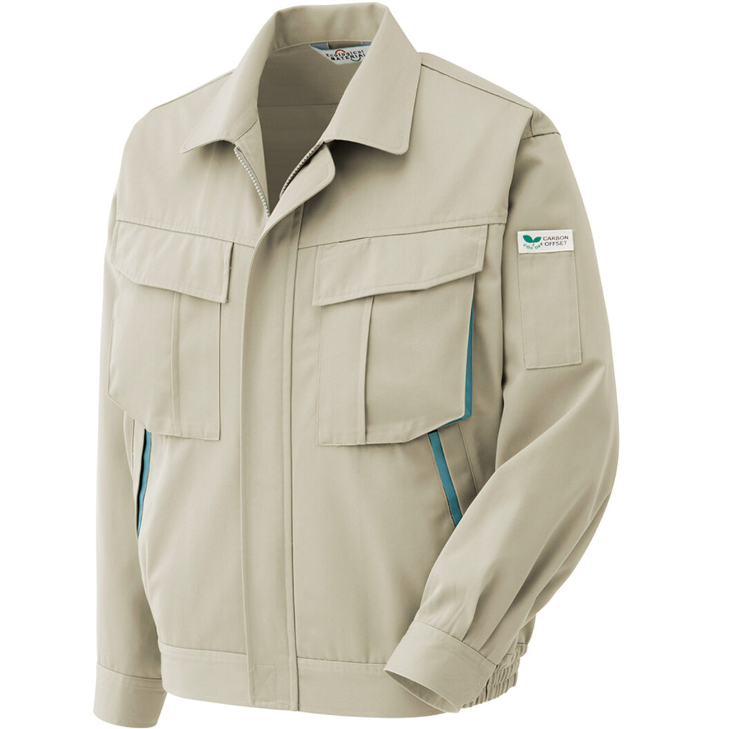 高いコストパフォーマンス+エコ+帯電防止のカーボンオフセット・ユニフォームです。帯電防止作業服JIS適合品、面ファスナー:前立て・胸ポケット・カフス、ポケット位置:左右胸ポケット(左胸ペン挿し付き)、左右脇ポケット、左袖ペン挿し、左胸内ポケット