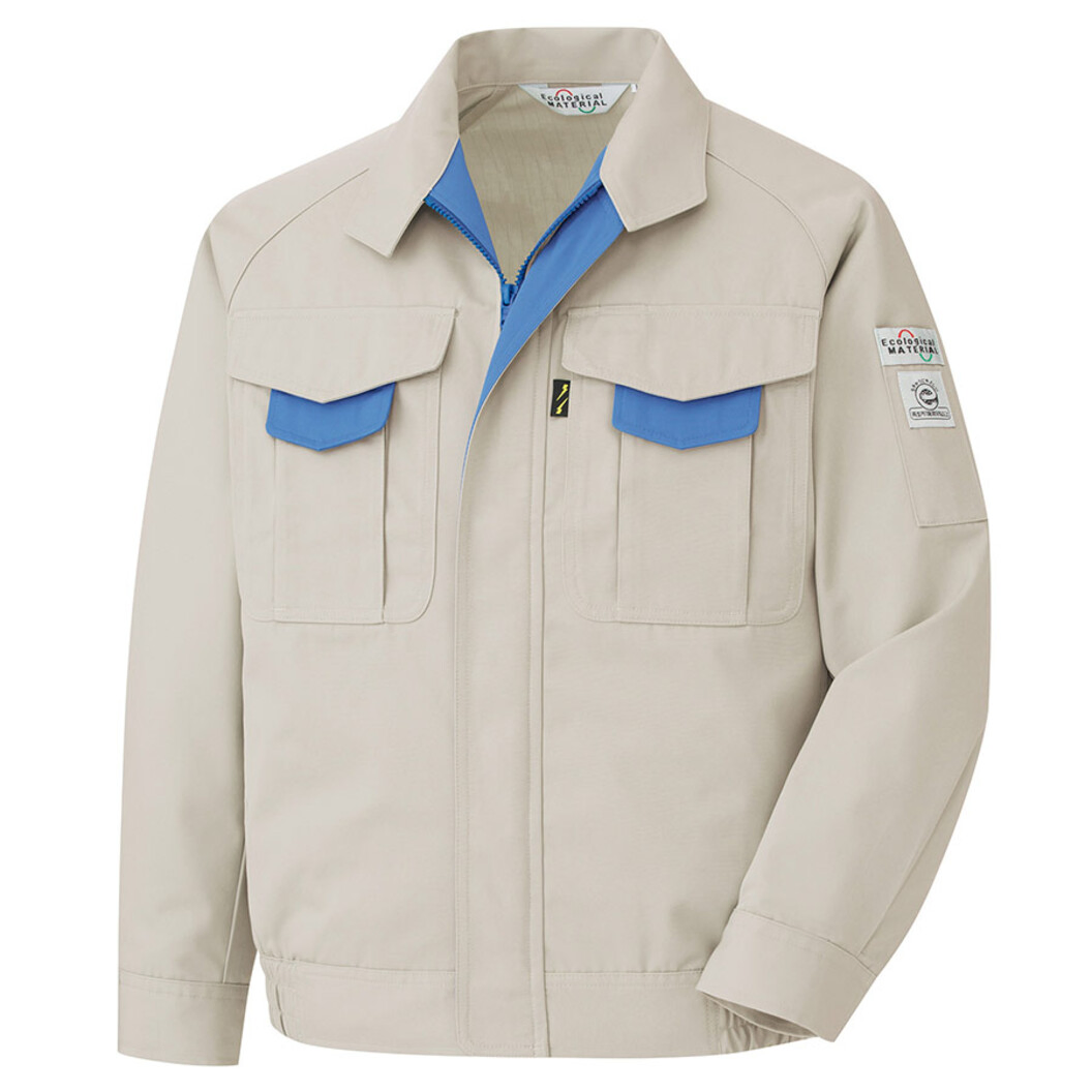 立体裁断構造の採用で、かつてない動きやすさを実現。内側には図面などを収納できる大型ポケットも確保。 抜群の洗濯耐久性と機能性を併せ持つ、快適な着心地のリサイクルユニフォーム。 ラグランスリーブ、立体裁断構造等により動きやすさを追求した商品です。 帯電防止作業服JIS適合品