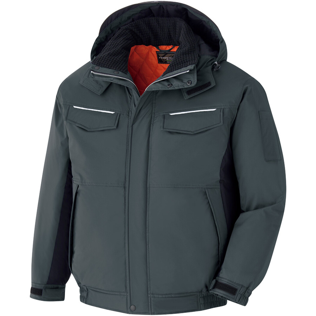 独自の裁断構造を採用したことで、上挙運動、内旋運動に加えて、腕の旋回運動をもサポート。360°すべてにおいてストレスのない動きを実現しました。ヘルメット着用時でも、耳、首もとを冷気にさらさず、上からすっぽり覆えるフード付き。フード縁の広さを自在に調節でき、頭の動きに合わせて伸縮するゴムコードを採用。ぴったりとフィットして外気の侵入をシャットアウト。夜間時における安全性を考慮して、再帰性の反射材を採用しました。生地の裏面にポリウレタンコーティングをほどこすことで、優れた防水性を実現。耐水圧5000mm。帯電防止作業服JIS適合品。素材(表):ポリエステル100%、素材裏:身頃:ポリエステルキルト・中わた120g/㎡、袖:ポリエステルタフタキルト・中わた80g/㎡、ファスナー:樹脂・引手樹脂(前あき)、ドットボタン:樹脂(前立て・フード)、面ファスナー(前立て・胸ポケット・袖口・フード)、ポケット位置:左右胸ポケット・左右脇ポケット・左袖ペン挿し・左胸内ポケット