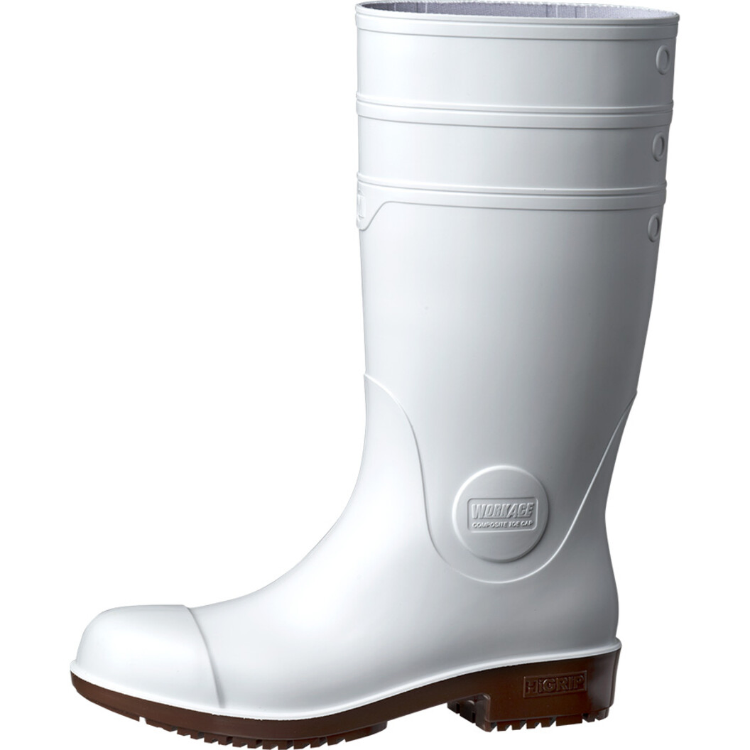 靴底パターンを斜めに配置する事で前後だけではなく、横・斜め方向へのグリップ力を強化。更に、硬い金属面やタイル等の凹凸のある床が混在する環境でも高い耐滑性を発揮します。(スリップサイン付) 内側底面から履き口にかけ伸びた4本のエアチャネルにより、靴内のムレを効果的に逃がします。さらに取り外し可能な通気インソールにより不快なムレを軽減します。 筒が細い、または太い場合には、お手持ちの紐等を使用し調整可能な穴あけ溝付。 用途や体型に合わせてハサミで簡単にカット調整できるライン付き。 幅広で軽量なワイド樹脂先芯搭載。樹脂製のため、鉄と比べつま先が冷えにくく、錆びる心配がありません。 一般的な耐油・耐薬品性に加え動植物性油にも強い素材を使用しています。 抗菌性能:食品生産・加工・厨房などでの安全管理や衛生管理に。 水・油・薬品が靴内に浸透するのを防ぐ仕様の靴です。