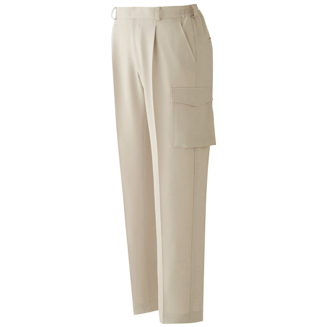 植物由来の合成繊維を採用したワークウエアで、業界初のエコマークを取得した、動きやすさにこだわったT/Cストレッチワークウエアです。 しゃがんだ際にプリーツが伸びることにより、背中やインナーウエアが見えにくくなりました。 また、後腰部に伸縮メッシュを施すことで、前後や斜めの屈伸の動きをスムーズにしました。 従来のパンツに比べ腹部への圧迫や引きつれを軽減します。 股部 新立体裁断構造(フル開脚仕様):開脚運動をサポートするマチを股下部分に入れることにより、開脚姿勢をとった際の引きつれを防止し、快適に作業を行うことができます。 衣装内にこもった空気を循環させるスリットを、設けています。 エコマーク認定商品(第15103004号) ポケット位置:左右脇ポケット、左右後ポケット、左右カーゴポケット