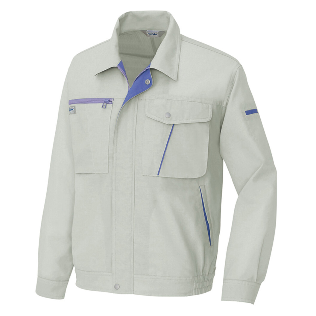 綿100%の素材を使用した、通気性に優れている、夏でも快適に着用することができるサマーブルゾンです。 肩エプロン付きで、動きやすくなっています。 左胸にペン差し、右胸にペン差しポケット、左袖にネーム刺繍ポケット、両サイドにハンマーループ、背中にベンチレーション、裾にドローコードが付いています。