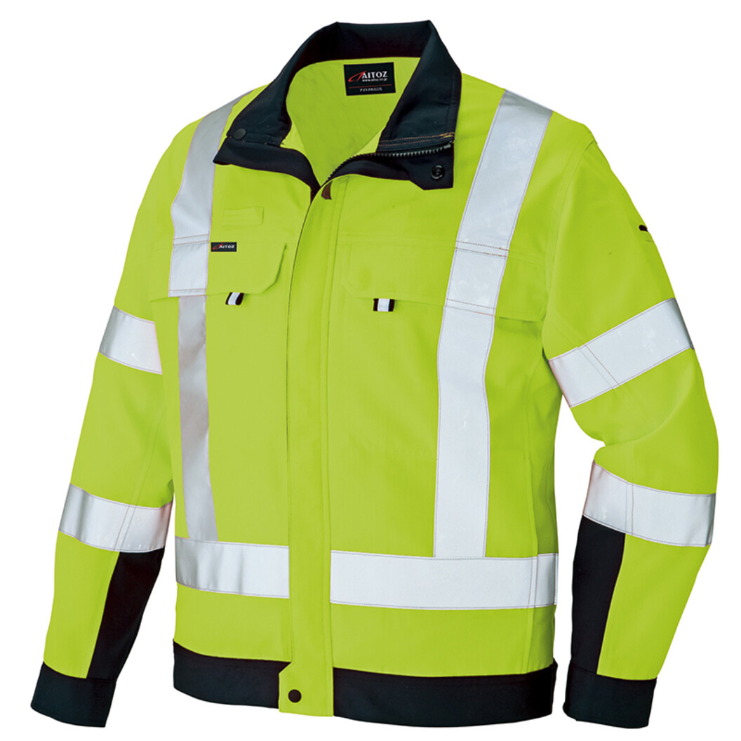 作業着として最適なブルゾンです。 ポリエステル100%の素材を使用しており、丈夫で耐久性に優れています。 また、裏メッシュ仕様で、通気性が良く、夏でも快適に着用できます。 襟部分はファスナー仕様で、風の侵入を防ぐことができます。 両脇にはポケットが付いており、小物を収納するのに便利です。 袖口はゴム仕様で、風の侵入を防ぎます。 裾部分はドローコード付きで、サイズ調整が可能です。 背中にはベンチレーション(マジックテープ付き)が付いています。