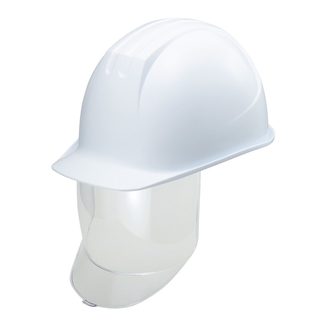 PE製の大型シールド面付きタイプのヘルメットです。帽体は薬品に強いポリエチレン製で、シールド面は耐薬品特殊加工仕様。出し入れ自由なシールド面を帽体に内蔵。大型シールドメットの軽量型。耐薬品性に優れたポリエチレン帽体です。大型シールド面で顔全面をガード、しかもシールド面は帽体内に出し入れ自由でひさしにピッタリおさまり、スタイリッシュに。シールド面の引き出し長さは、タニザワSHシリーズの約2倍と大型サイズ。電気工事における短絡アーク、粉じん・薬液などから顔面をしっかりガードします。また、くもりにくい防曇加工を施しました。メガネやマスクの着用時に便利なチルトロック機構。シールド面は全て引き出した状態から前に押し出してロックすることができます。メガネやマスクを着用して作業するときに便利です。(顔の形やマスクの種類により、シールド面に当たる場合があります。)