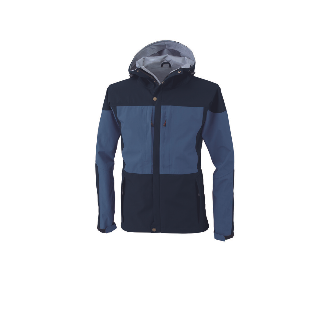 耐水性、透湿性のあるストレッチ素材の裏にトリコットをラミネートした三層構造素材です。汗をかいてもベタつかず、サラッとした着心地です。同系色のツートンカラーはアウトドア、普段着としてもオススメのデザインです。
