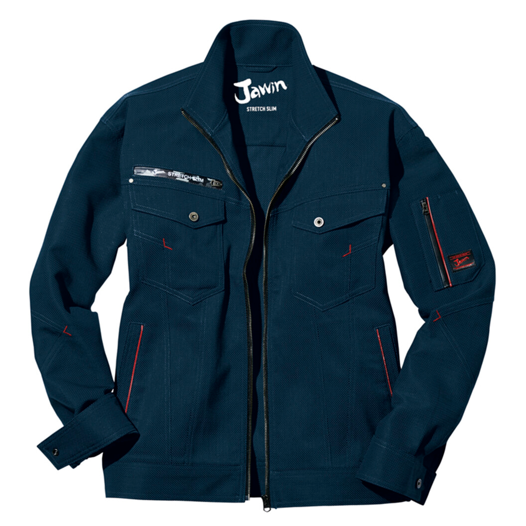 インパクト抜群のカモフラファスナーとレッドパイピング。高級感のある光沢を出した変わり織り素材とカモフラ柄のファスナー、レッドパイピング、オリジナルワッペンがJawinらしさを醸し出すカジュアルテイストワークウェアです。