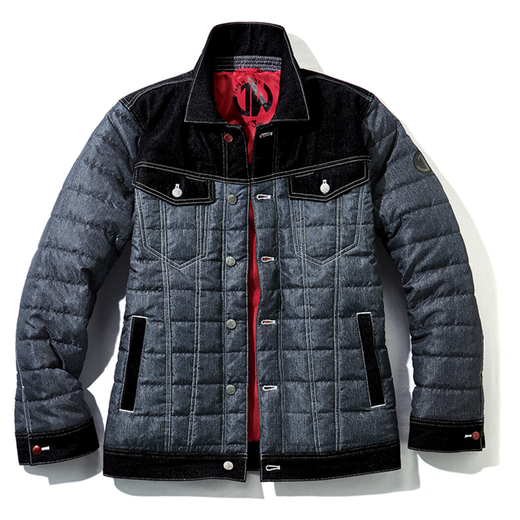 カジュアルテイスト防寒ジャンパー。デニム生地とデニムプリント生地を組み合わせてデザイン性を追求した防寒ジャンパーです。