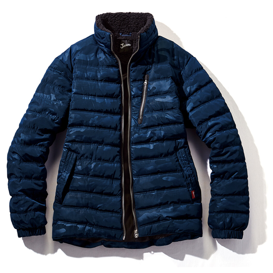 カモフラ柄のエンボス加工がさりげなく個性を演出し、普段着感覚で着用できる軽量防寒です。