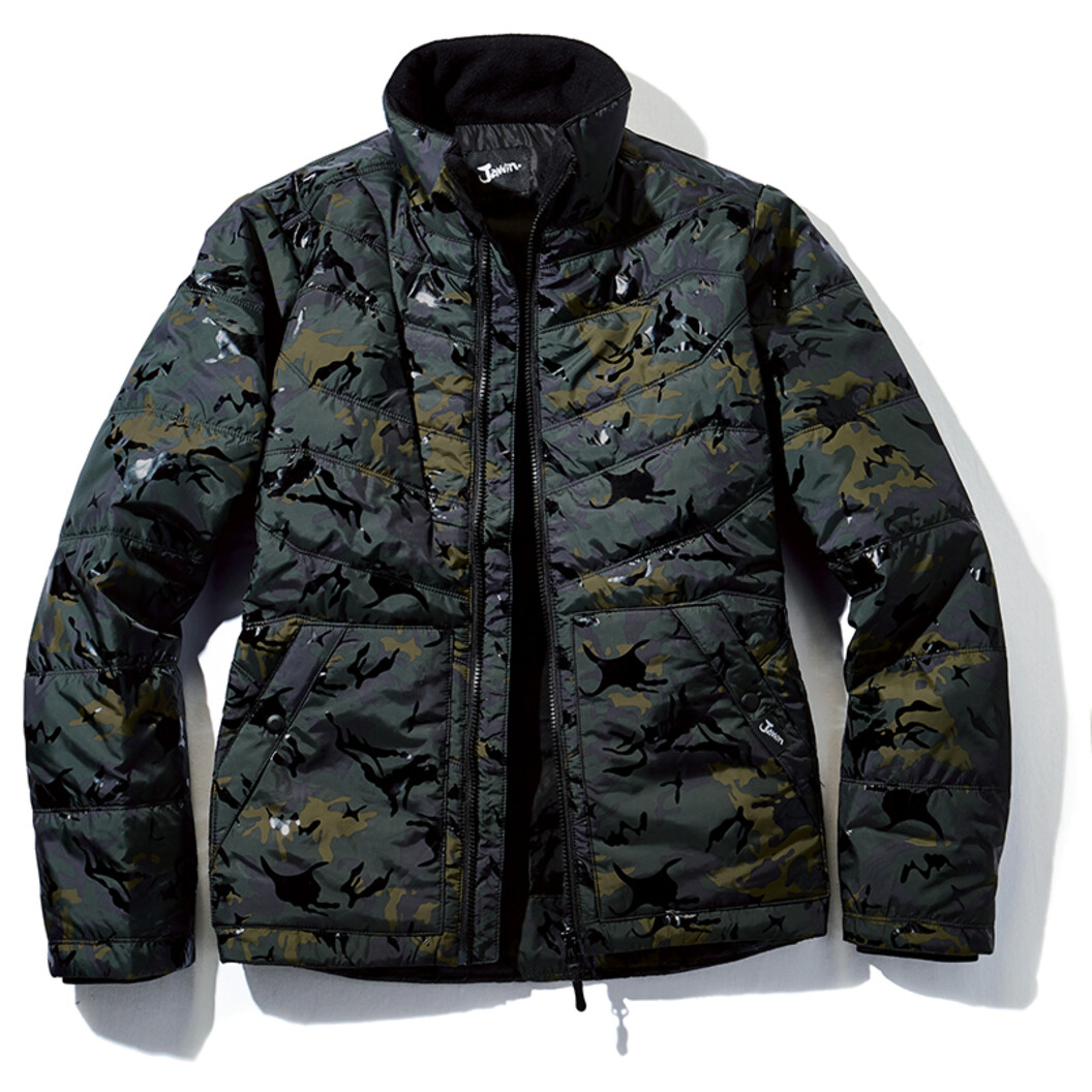 存在感際立つ防寒ジャンパー。カモフラ柄と光沢感を融合させてデザイン性を追求した軽量防寒です。