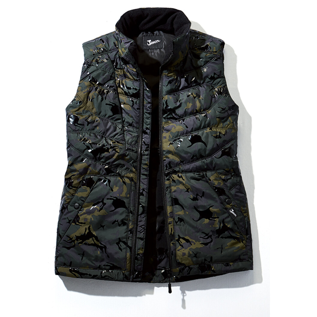 存在感際立つ防寒ベスト。カモフラ柄と光沢感を融合させてデザイン性を追求した軽量防寒です。